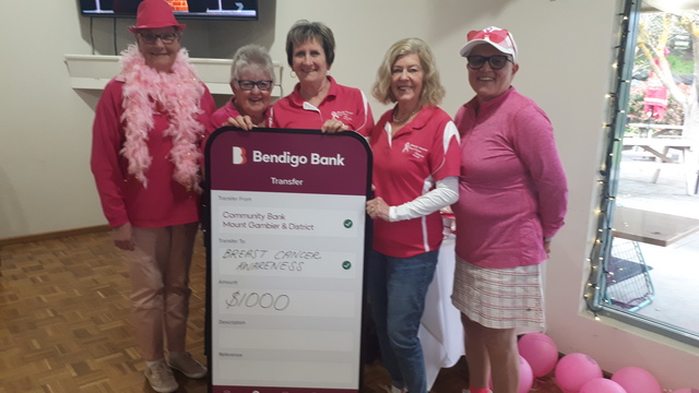 A presentation of the money raised was made by Blue Lake Golf Club women's vice-president Beryl Mahoney, women's vice captain Bev Pascoe and Karen Panagopoulos to Breast Cancer Awareness Group representatives chairperson Jill Gilmore and Lorraine Baron. (Supplied)